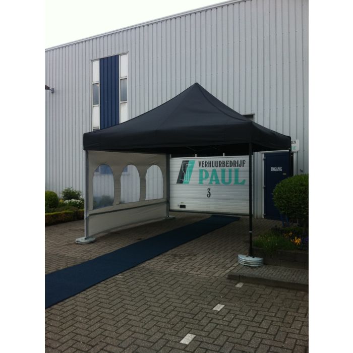 Kleur bovendoek is zwart, de zijkanten zijn licht grijs. Aan 1 zijde bevinden zich 3 raamvlakken. De afmetingen van de tent zijn 3 x 3 meter. Maten 3 x 3 meter