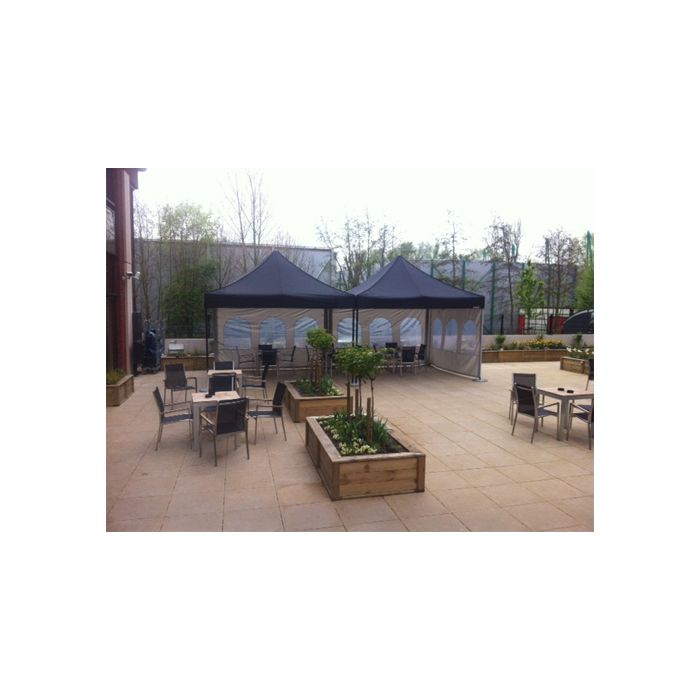 Kleur bovendoek is zwart, de zijkanten zijn licht grijs. Aan 1 zijde bevinden zich 3 raamvlakken. De afmetingen van de tent zijn 4 x 4 meter. Maten 4 x 4 meter, doorloophoogte 215 cm Nokhoogte 413 cm.