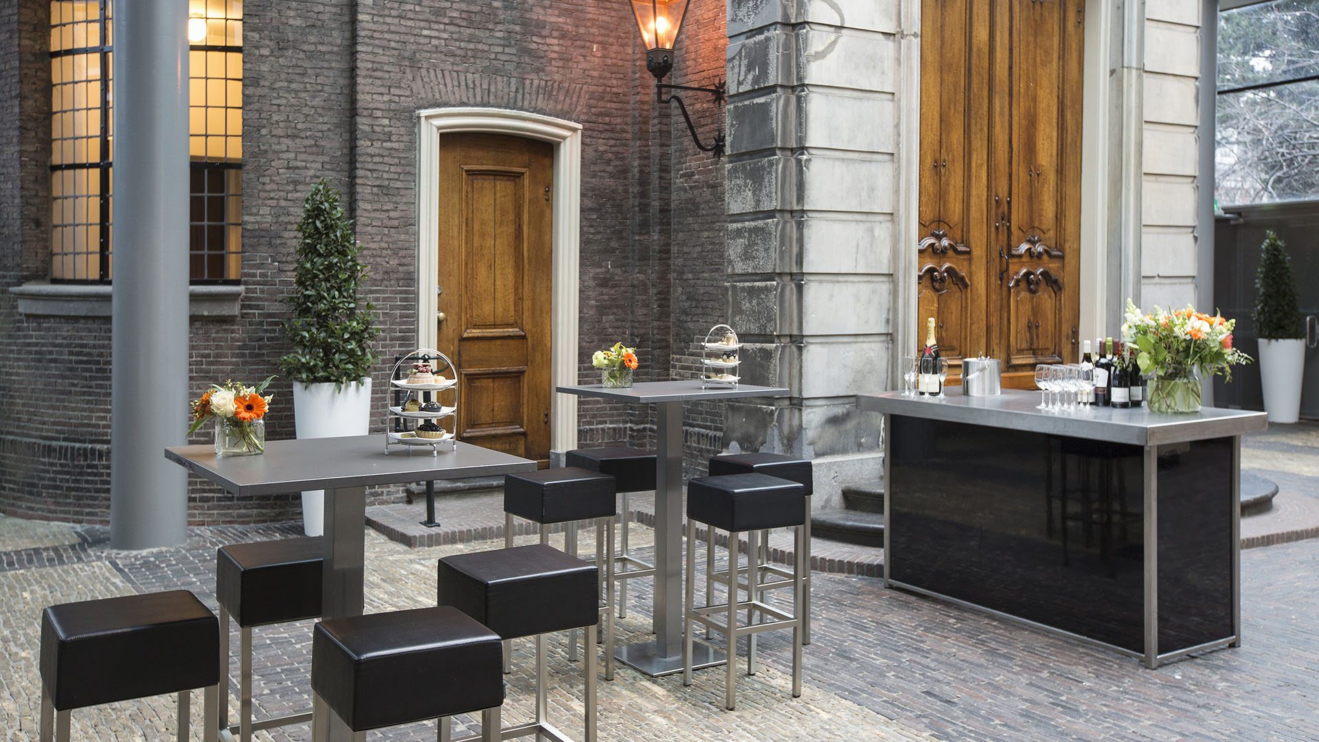 Deze meubellijn bestaat uit grijze vierkante sta-tafels en buffetten verkrijgbaar met een witte of zwarte onderkant en een RVS bovenblad. Voor deze lijn verhuren wij ook de bijbehorende stoelen en krukken.