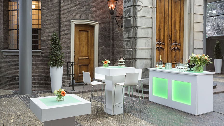 Deze meubellijn bestaat uit sta-tafels, terrastafels, buffetten en lampen voorzien van led verlichting instelbaar in diverse kleuren. Wij verhuren ook de bijbehorende stoelen en krukken.
