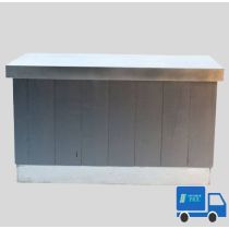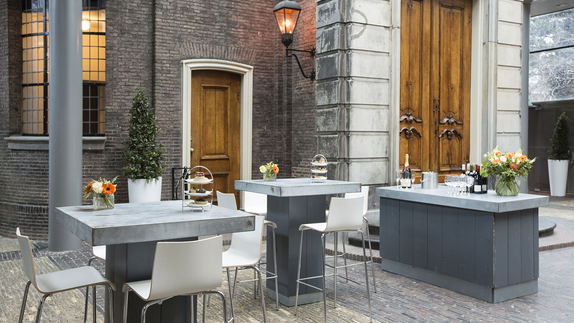 Deze meubellijn bestaat uit sta-tafels en buffetten met een grijze onderkant van hout en een zinken bovenblad voor buiten gebruik. Wij verhuren ook de bijbehorende stoelen en krukken.