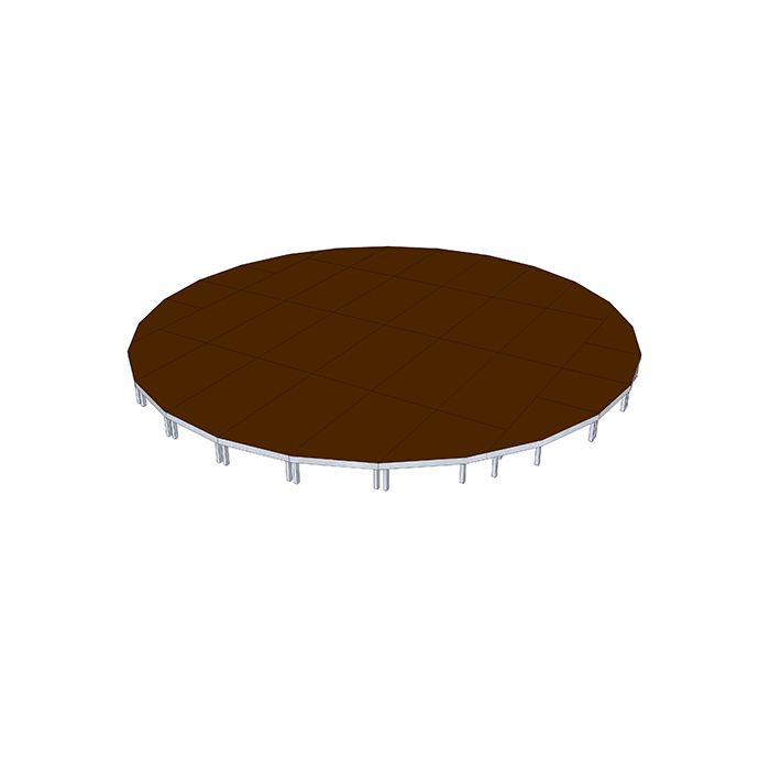 Ronde podia bestaan uit elementen die NIET langer zijn dan 200 cm. Bovenkant is uitgevoerd met een antislip toplaag in de kleur donkerbruin. Aan de zijkant van het profiel is standaard klittenband bevestigd voor de afrok. De diameter is 4, 6 of 8 meter maar kan ook in 1/2 of 1/4 worden geplaatst.